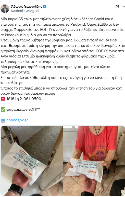 Στα Άνω Λιόσια πραγματοποιήθηκε η πρώτη δωρεάν διανομή φαρμάκων κατ’ οίκον από τον ΕΟΠΥΥ, με αποδέκτη μία 85χρονη γυναίκα που νόσησε με Covid-19. Όπως αναφέρει σε ανάρτησή του στο Χ ο υπουργός Υγείας, Άδωνις Γεωργιάδης, ο γιατρός της 85χρονης τής είπε να πάρει αμέσως το Paxlovid. Καθώς ήταν μόνη της και χρειαζόταν βοήθεια, τέθηκε, εν είδει τεστ, σε πρώτη κίνηση η υπηρεσία της κατά οίκον διανομής, που ξεκινά κανονικά από αύριο. «Μια μεγάλη μεταρρύθμιση για το σύστημα υγείας μας είναι πλέον πραγματικότητα» γράφει ο υπουργός Υγείας στην ανάρτησή του.