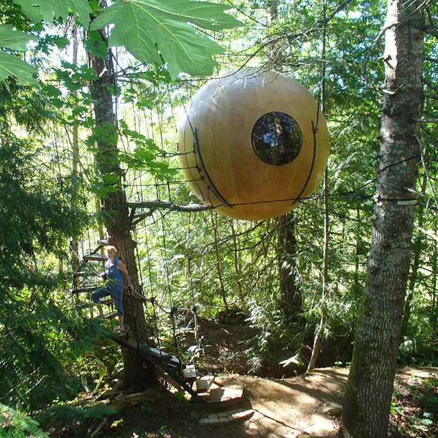 Κρεμασμένα ανάμεσα στα κωνοφόρα σαν μεγάλα χριστουγεννιάτικα στολίδια, τα Free Spirit Spheres στο νησί Βανκούβερ του Καναδά, σε κάνει να πιστεύεις πως « επιπλέεις στο θόλο ανάμεσα στα πουλιά που κοιμούνται», σύμφωνα με τον ιδιοκτήτη Tom Chudleigh.
