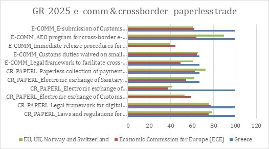 Στο Ηλεκτρονικό εμπόριο και το paperless διασυνοριακό εμπόριο, η Ελλάδα παρουσιάζει άριστες επιδόσεις στη νομοθεσία για ηλεκτρονικές συναλλαγές (100%) και την ηλεκτρονική ανταλλαγή Πιστοποιητικών Καταγωγής (100%).