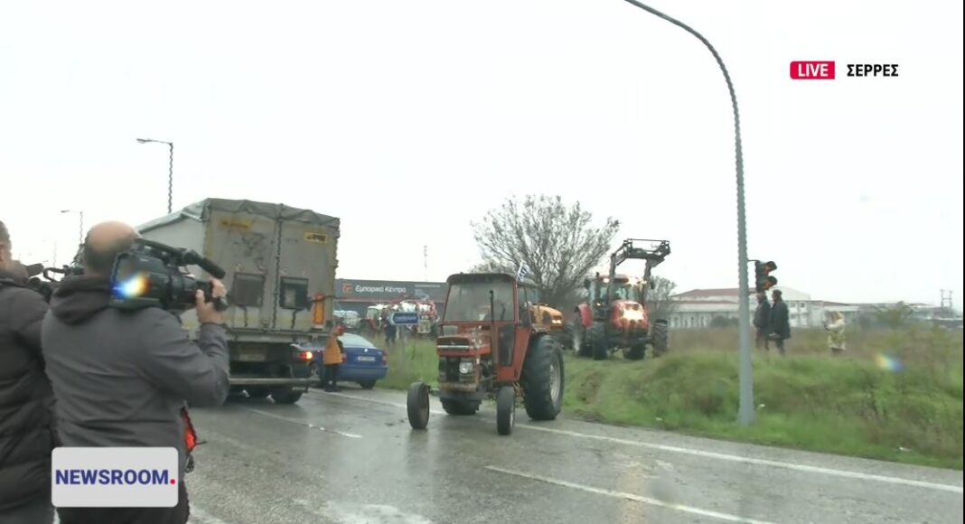 Αγρότες, κτηνοτρόφοι και μελισσοκόμοι από όλο το Νομό Σερρών με τρακτέρ έφτασαν λίγη ώρα πριν τις 12:00 στη διασταύρωση Σιδηροκάστρου στον κόμβο του Λευκώνα.