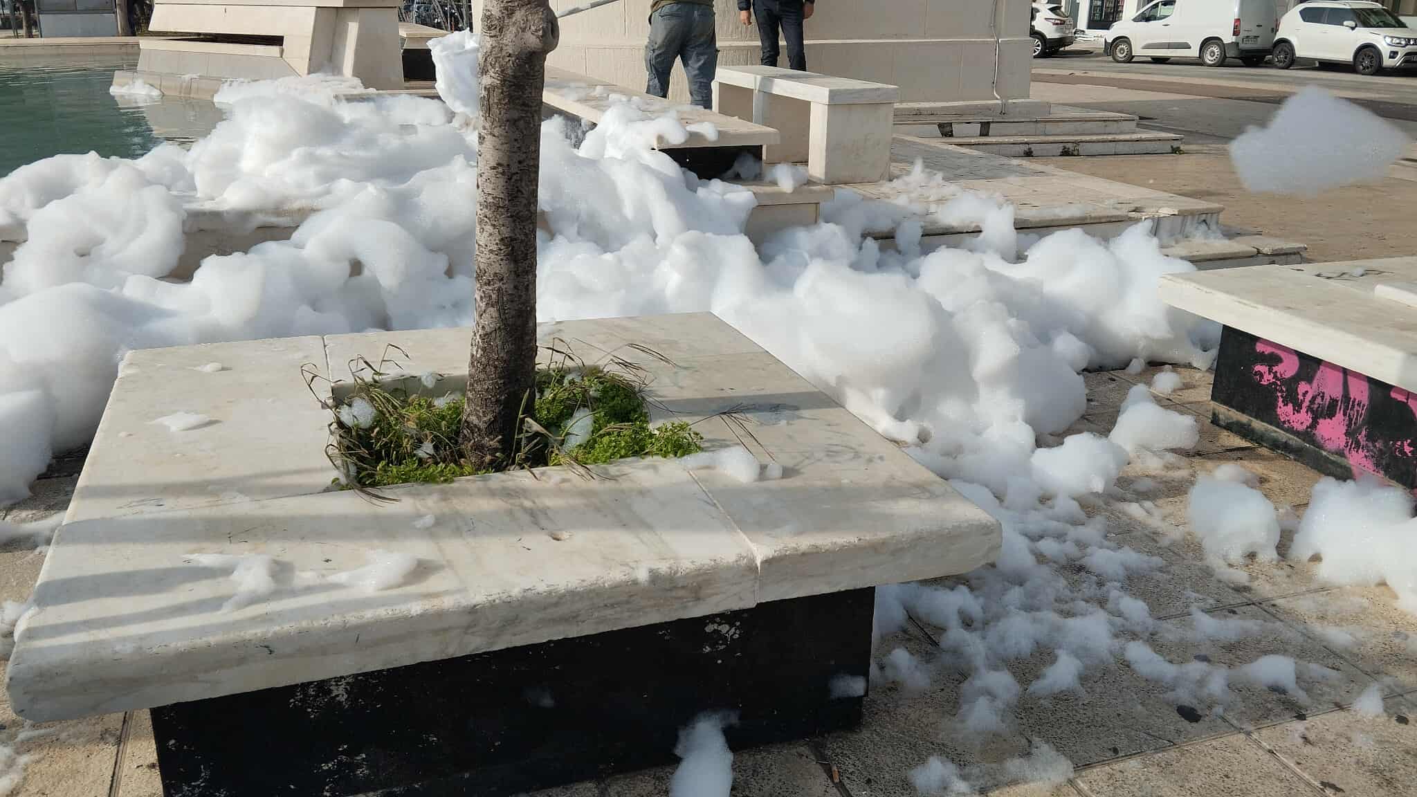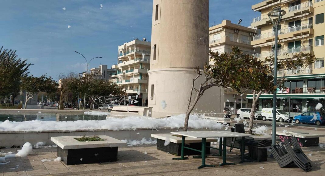 Ως αποτέλεσμα, η λειτουργία του συντριβανιού, σε συνδυασμό με τον ισχυρό νότιο άνεμο που έπνεε στην περιοχή, οδήγησε στη δημιουργία ενός τεράστιου όγκου αφρού. Το θέαμα ήταν πραγματικά εντυπωσιακό. Ο αφρός παρασυρόμενος από τον αέρα, έφτασε σε αρκετή απόσταση καλύπτοντας σημεία της πλατείας ενώ λόγω του ισχυρού αέρα έδινε την ψευδαίσθηση της χιονόπτωση.
