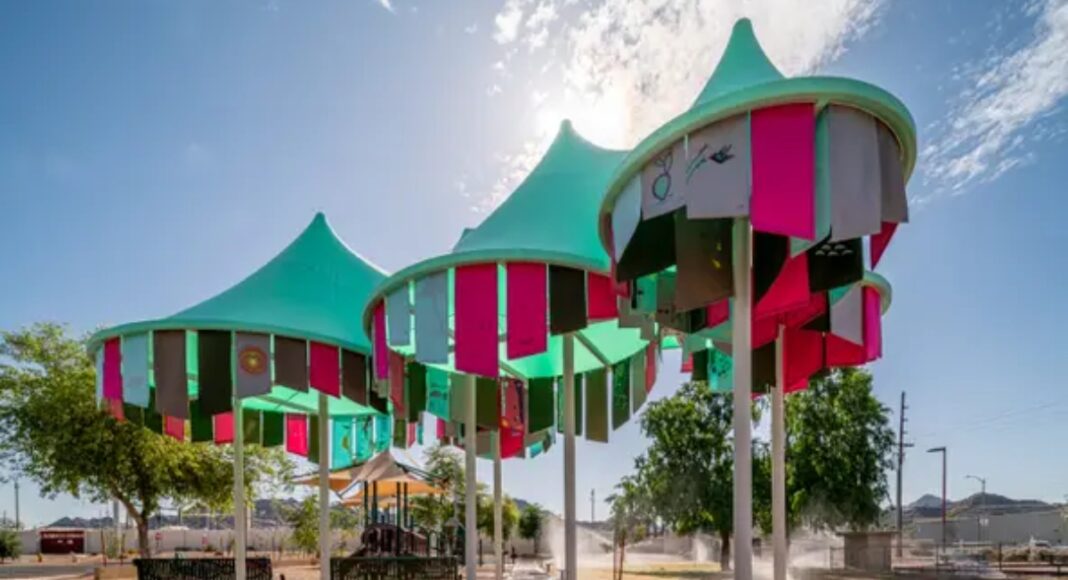 Σε ένα πάρκο στο Φοίνιξ, μια μεγάλη τέντα στηρίζεται σε πάνελ με εκθαμβωτικά χρώματα. Πάνω τους είναι ζωγραφισμένα ιδιότροπα πλάσματα που ονομάζονται «alebrijes» από τη μεξικανική λαϊκή τέχνη, και η κατασκευή περιλαμβάνει ένα σύστημα υδρονέφωσης που λειτουργεί με ηλιακή ενέργεια. Σε ένα άλλο πάρκο, ένα στέγαστρο διακοσμημένο με πολύχρωμα σχέδια χρησιμοποιεί ανακλαστική βαφή και έναν καμβά ανθεκτικό στην υπεριώδη ακτινοβολία.