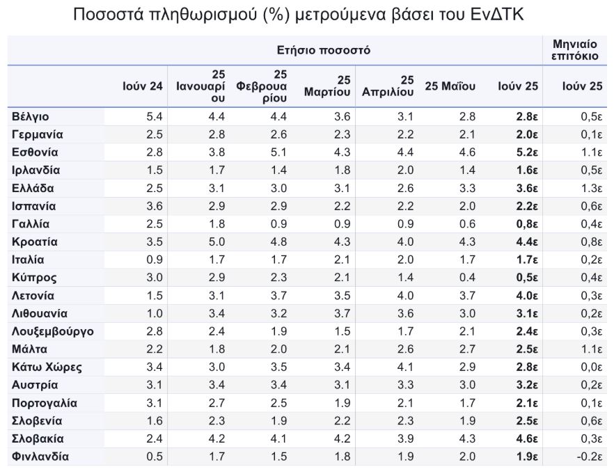 Σύμφωνα με την προκαταρκτική εκτίμηση της Eurostat, της στατιστικής υπηρεσίας της Ευρωπαϊκής Ένωσης, ο ετήσιος πληθωρισμός στην ευρωζώνη αναμένεται να διαμορφωθεί στο 2,0% τον Ιούνιο του 2025, σημειώνοντας μικρή άνοδο από το 1,9% του Μαΐου. Η εξέλιξη αυτή αντικατοπτρίζει τις συνεχιζόμενες πιέσεις στις τιμές, οι οποίες παραμένουν κοντά στον στόχο της Ευρωπαϊκής Κεντρικής Τράπεζας για πληθωρισμό κοντά αλλά κάτω από το 2%.
