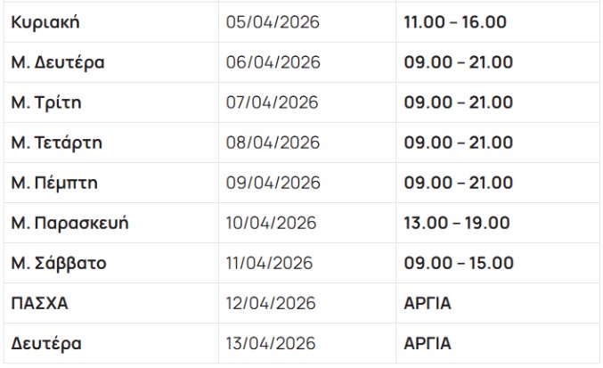 • Τη Μεγάλη Παρασκευή 10/4, τα καταστήματα θα λειτουργήσουν από τις 13:00 έως τις 19:00, ενώ το Μεγάλο Σάββατο 1/4 από τις 10:00 έως τις 16:00.