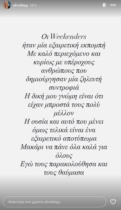 «Μακάρι να πάνε όλα καλά για όλους. Εγώ τους παρακολούθησα και τους θαύμασα», καταλήγει στο σύντομο μήνυμά της για τους Weekenders η Αφροδίτη Γραμμέλη.