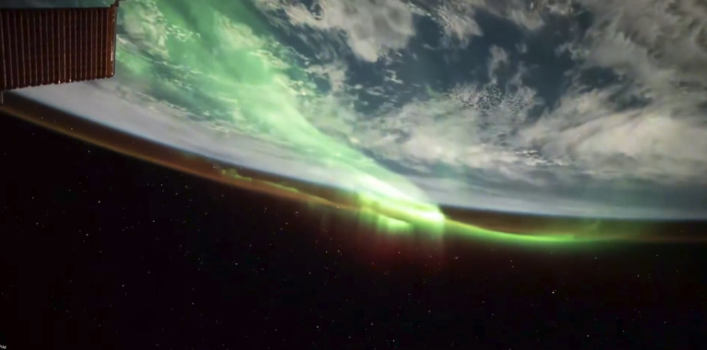 Το timelapse, που καταγράφηκε από τον Διεθνή Διαστημικό Σταθμό (ISS), δείχνει τα φωτεινά κύματα να λαμπυρίζουν πάνω από τη Γη, ενώ μια λεπτή πορτοκαλί γραμμή της ατμόσφαιρας τονίζει το περίγραμμα του πλανήτη.