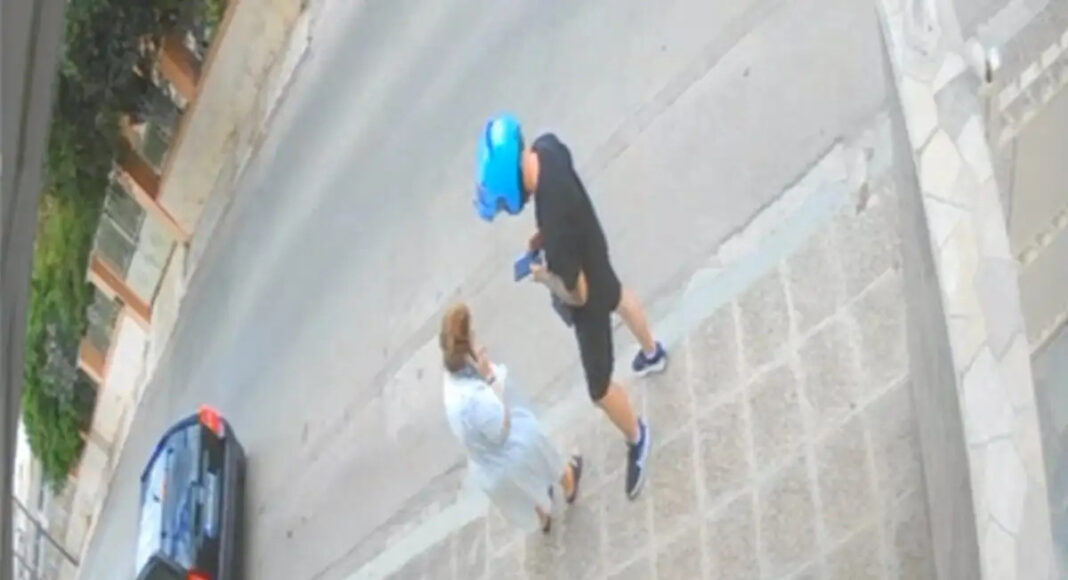 Στο βίντεο διακρίνεται ένα μέλος του κυκλώματος να συναντά μια ηλικιωμένη έξω από μια πολυκατοικία και να συνομιλούν.