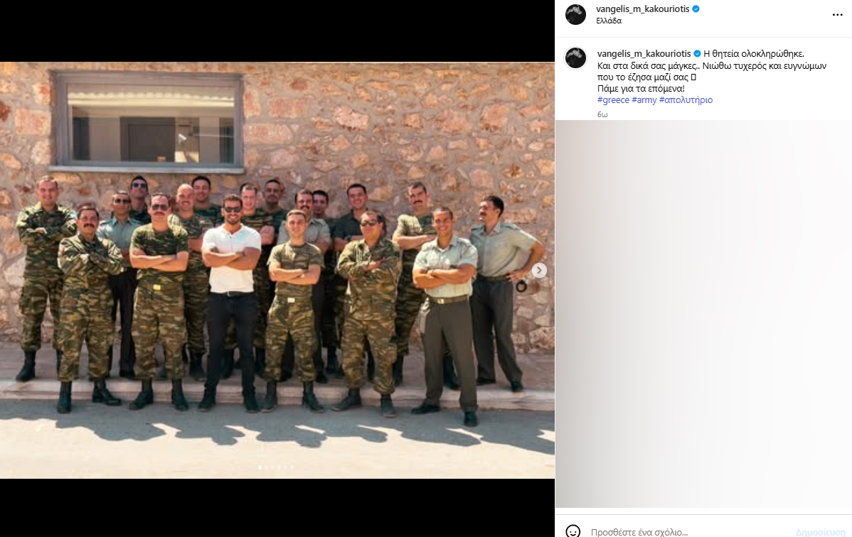 Ο Βαγγέλης Κακουριώτης ολοκλήρωσε τη στρατιωτική του θητεία και απολύθηκε σήμερα, γεγονός που μοιράστηκε με τους διαδικτυακούς του φίλους μέσω ανάρτησης στο Instagram.