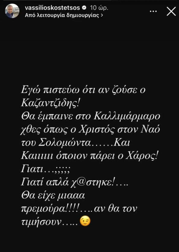 «Εγώ πιστεύω ότι αν ζούσε ο Καζαντζίδης θα έμπαινε στο Καλλιμάρμαρο χθες όπως ο Χριστός στον ναό του Σολομώντα… Και όποιον πάρει ο χάρος! Γιατί; Γιατί απλά χ..στηκε! Θα είχε μία πρεμούρα αν θα τον τιμήσουν…!!!», έγραψε ο Βασίλειος Κωστέτσος.