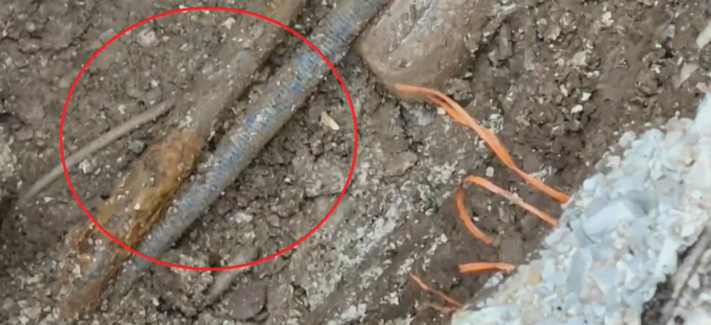 Δίπλα στο μπλε καλώδιο της ηλεκτρικής παροχής εντοπίζεται σωλήνας που είναι κατεστραμμένος από την οξείδωση. Όταν αυτός αποκαλύφθηκε στο σκάμμα, η έντονη μυρωδιά αερίου από τα σημεία διαφυγής κατέκλυσε τον χώρο.