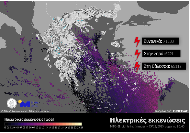 Ως τις 10:40 της Παρασκευής 05/12 εξάλλου, καταγράφηκαν 6221 ηλεκτρικές εκκενώσεις πάνω από την ξηρά και 65112 πάνω από τη θάλασσα.
