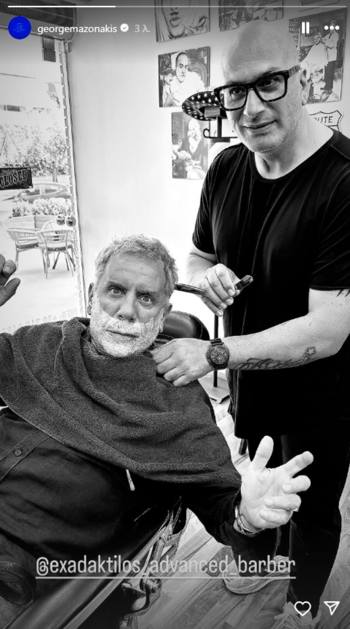 Στη φωτογραφία που ανέβασε σε Insta-story, ο Γιώργος Μαζωνάκης φαίνεται καθισμένος στην καρέκλα του κουρείου, με αφρό ξυρίσματος στο πρόσωπο, αποτυπώνοντας τη στιγμή της φροντίδας της εμφάνισής του.