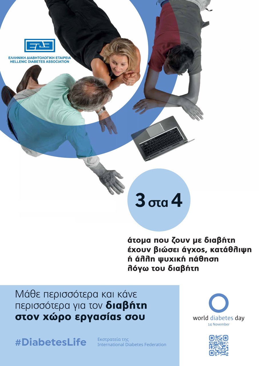 Από την πλευρά του, ο Γενικός Γραμματέας της ΕΔΕ Σταύρος Θ. Λιάτης, Διδάκτωρ Πανεπιστημίου Αθηνών, τέως Διευθυντής ΕΣΥ, Διαβητολογικό Κέντρο, ΓΝΑ «ΛΑΪΚΟ», υπογραμμίζει ότι «η φετινή Παγκόσμια Ημέρα Διαβήτη αποτελεί πρόσκληση στους εργοδότες, τους εργαζομένους και την παγκόσμια κοινότητα να μάθουν περισσότερα και να κάνουν περισσότερα για τον διαβήτη στον χώρο εργασίας.