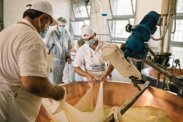 Αν θέλετε να ζήσετε την παρασκευή της Parmigiano Reggiano, πρέπει να φτάσετε νωρίς. Στις επτά ή οκτώ το πρωί, οι επισκέπτες περνούν από τα υπόστεγα αρμέγματος προς την αίθουσα παρασκευής.