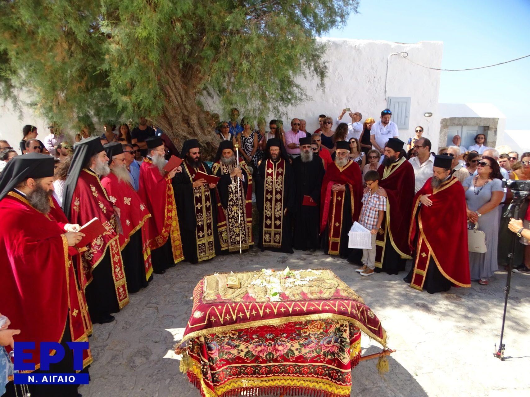 Η περιφορά του Επιταφίου της Μεγάλης Παναγιάς την παραμονή του Δεκαπενταύγουστου στις πλατείες της Χώρας ενώ ψάλλονται τα Εγκώμια της Κοιμήσεως της Θεοτόκου απο τον κλήρο της Ι.Μονής του Αγίου Ιωάννου του Θεολόγου με τον ηγούμενο και Πατριαρχικό ΄Έξαρχο Πάτμου κ. Κύριλλο