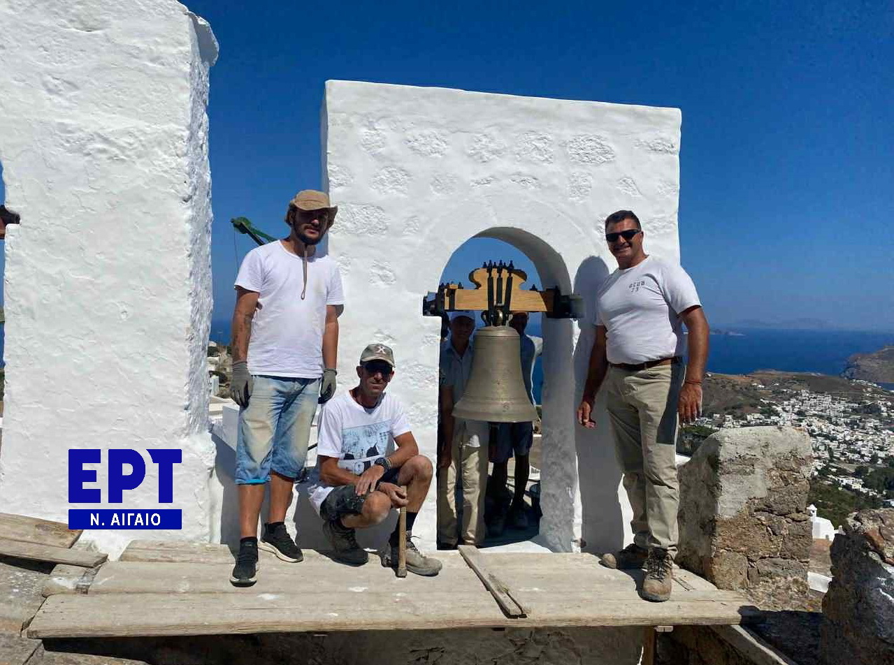 Το συνεργείο των Πατμίων μαστόρων Χρήστου και Θωμά Υψηλάντη μόλις έχουν τοποθετήσει την συντηρημένη ιστορική καμπάνα στην εκκλησία της Μ.Παναγίας