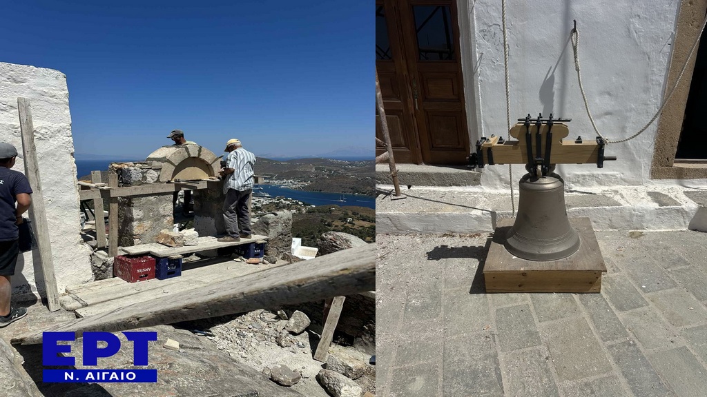 Το συνεργείο των Πατμίων μαστόρων Χρήστου και Θωμά Υψηλάντη μόλις έχουν τοποθετήσει την συντηρημένη ιστορική καμπάνα στην εκκλησία της Μ.Παναγίας