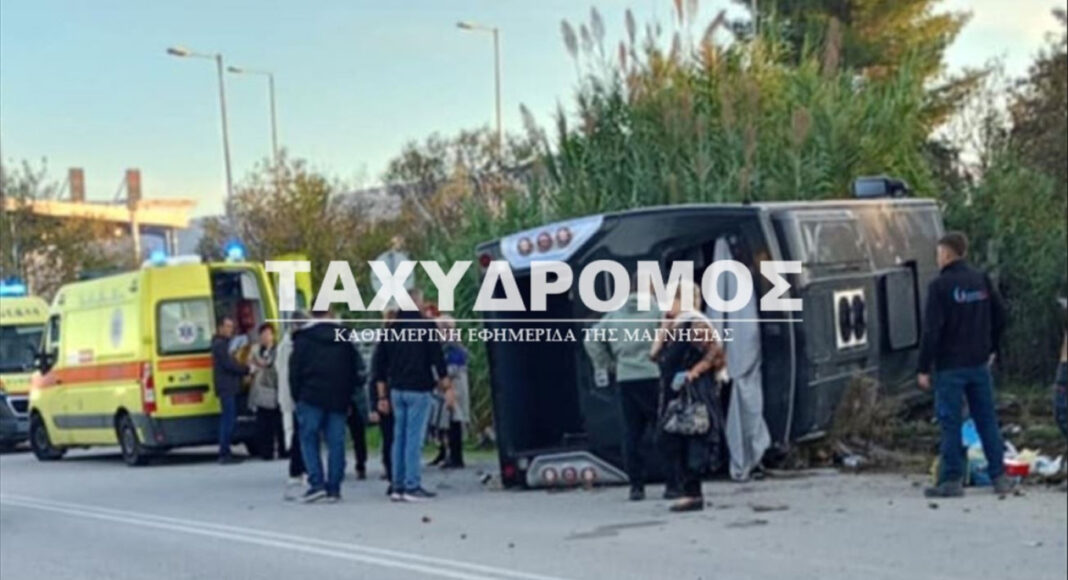 Ένα λεωφορείο με περίπου 40 επιβάτες εξετράπη από την πορεία του και ανατράπηκε το απόγευμα του Σαββάτου στην παλιά Εθνική Οδό πριν τον Ριζόμυλο του Βόλου, ένα χιλιόμετρο πριν το κέντρο διασκέδασης «Μέγαρο».