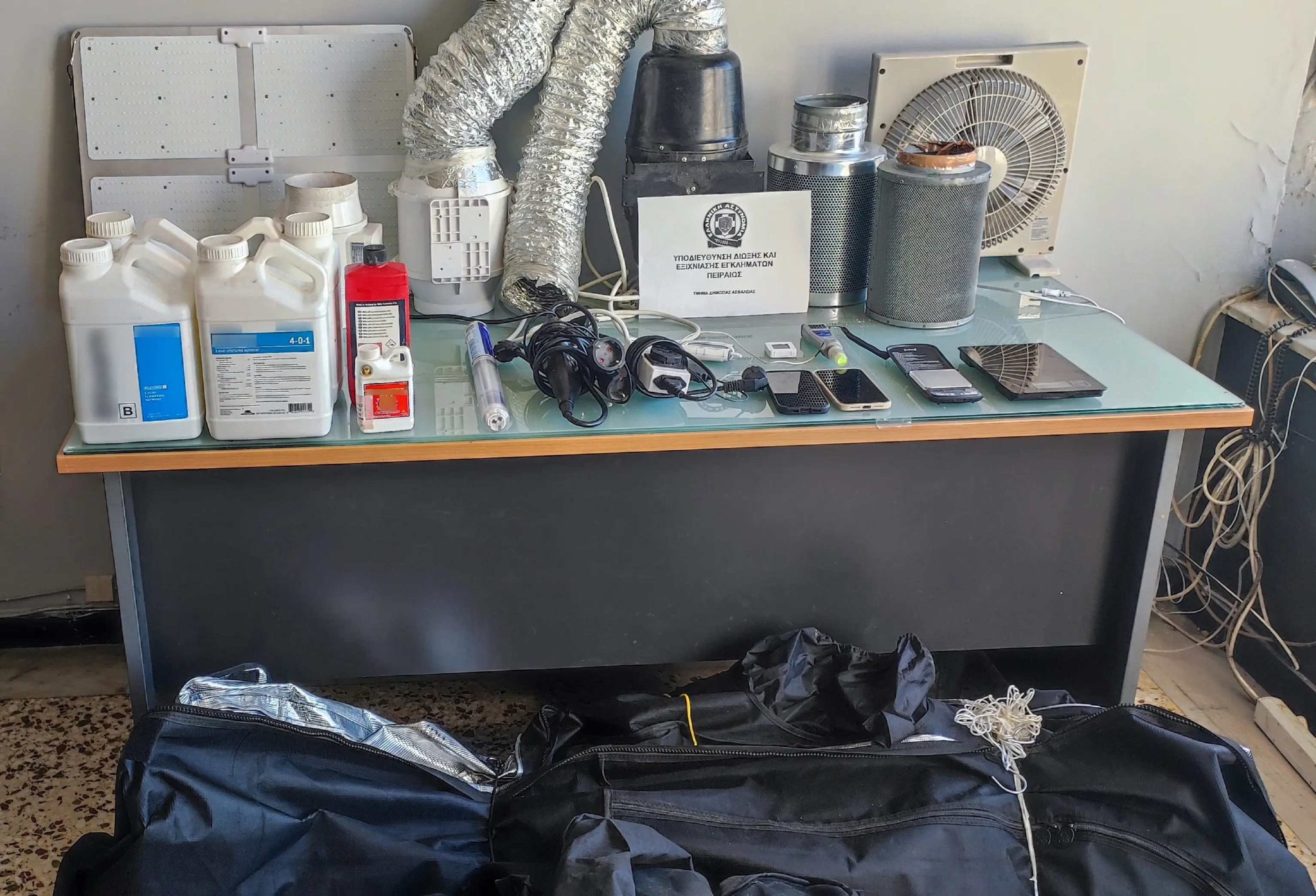 Στον χώρο βρέθηκαν και κατασχέθηκαν: πλήρως εξοπλισμένο εργαστήριο καλλιέργειας κάνναβης με ζυγαριές, ψηφιακά θερμόμετρα, φυσούνες εξαερισμού, ανεμιστήρες και αφυγραντήρες, οκτώ (8) δενδρύλλια κάνναβης, 315 γραμμάρια φυτικών αποσπασμάτων κάνναβης και το χρηματικό ποσό των 135 ευρώ.
