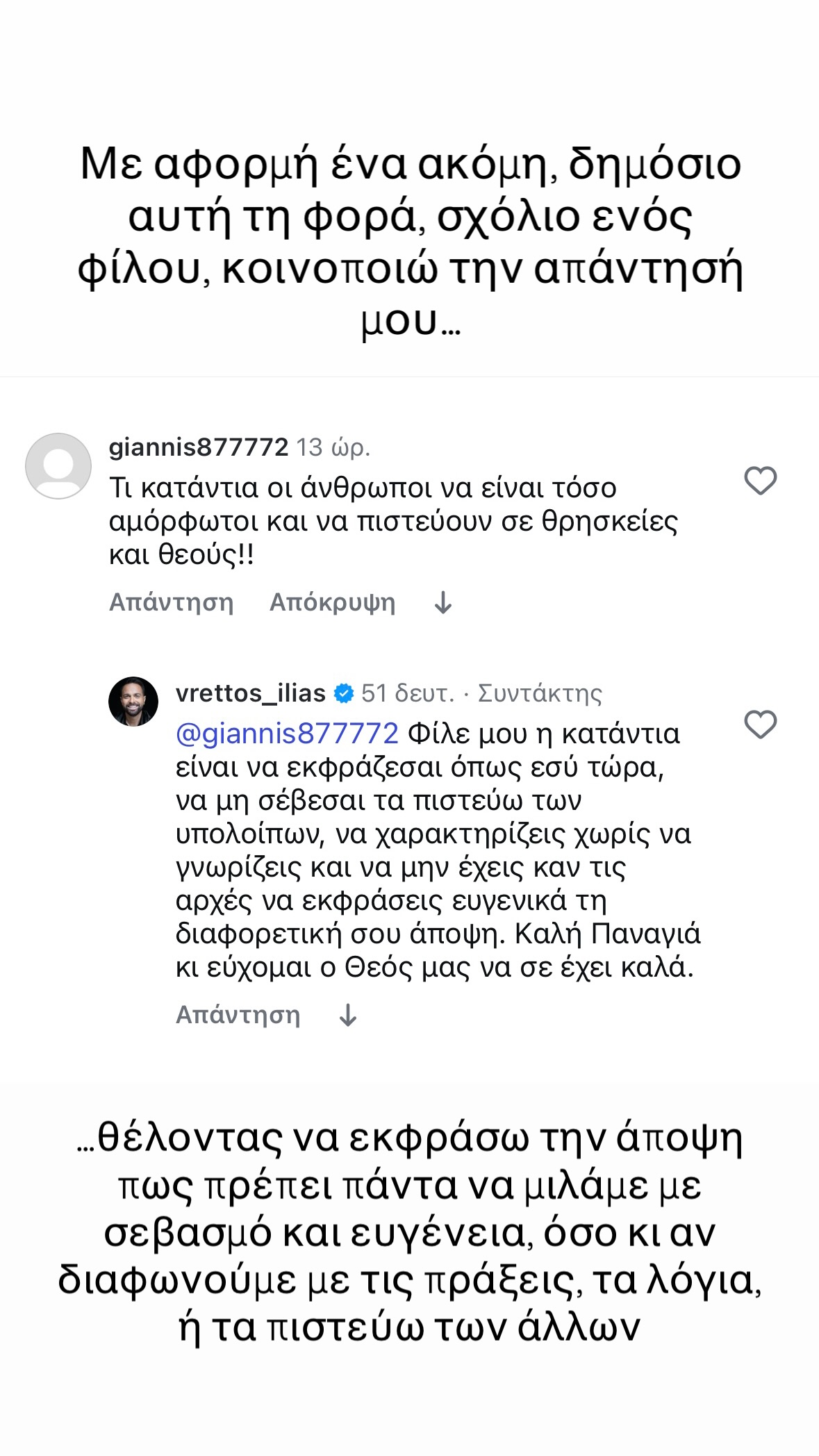 «Με αφορμή ένα ακόμη, δημόσιο αυτή τη φορά, σχόλιο ενός φίλου, κοινοποιώ την απάντηση μου… θέλοντας να εκφράσω την άποψη πως πρέπει πάντα να μιλάμε με σεβασμό και ευγένεια, όσο κι αν διαφωνούμε με τις πράξεις, τα λόγια ή τα πιστεύω των άλλων».