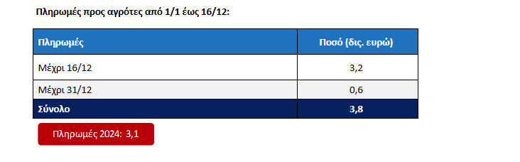 Με αυτό το ποσό, οι καταβολές που έχουν γίνει στους αγρότες από την 1 Ιανουαρίου 2025 μέχρι σήμερα ανέρχονται σε 3,2 δις ευρώ ενώ μέχρι τέλος του μήνα αναμένεται να καταβληθούν ακόμα περίπου 600 εκατ. ευρώ.