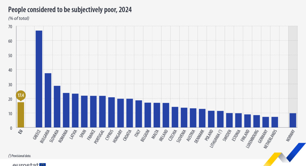 Η Eurostat ανακοίνωσε σήμερα ότι το ποσοστό υποκειμενικής φτώχειας στην Ευρωπαϊκή Ένωση μειώθηκε το 2024 στο 17,4%, έναντι 19,1% το 2023, αντανακλώντας μια ευρύτερη τάση βελτίωσης στα κράτη μέλη.