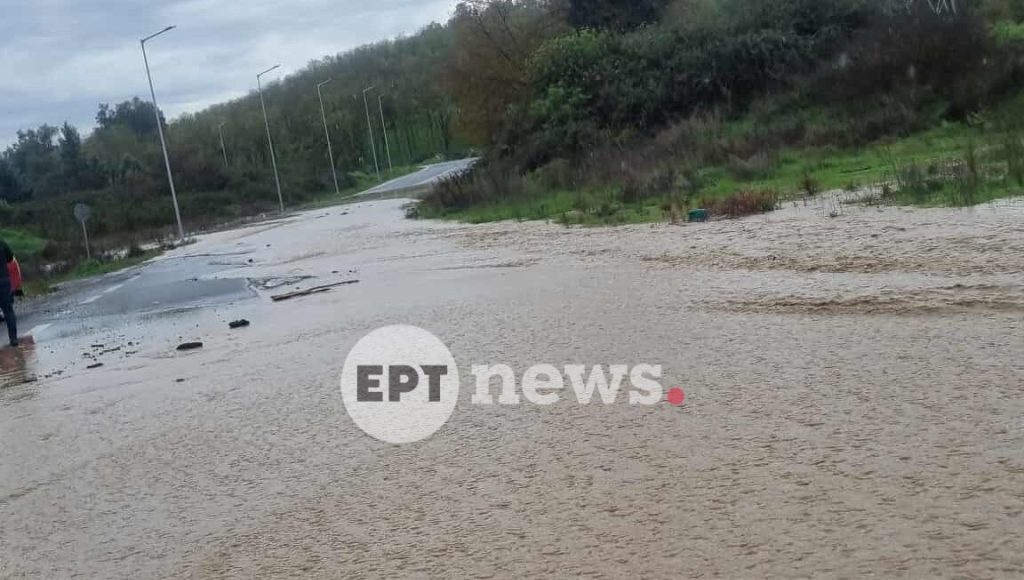 Ρέμα που βρίσκεται παράλληλα με τον δρόμο υπερχείλισε, με αποτέλεσμα να πλημμυρίσει το οδόστρωμα και στα δύο ρεύματα κυκλοφορίας.