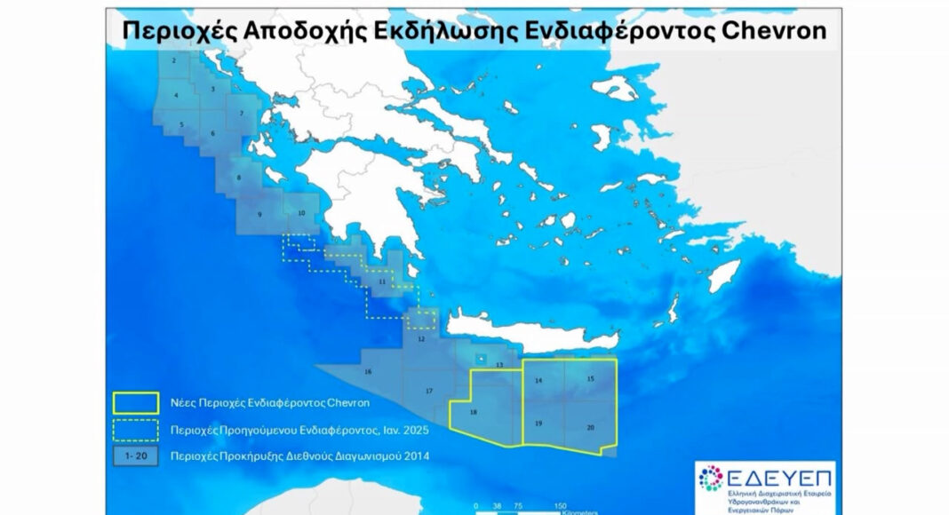 Με τις συμφωνίες μίσθωσης που υπ΄γραψε σήμερα η ελληνική κυβένρηση με την κοινοπραξίας Chevron – Helleniq Energy παραχωρούνται αποκλειστικά δικαι’ωματα έρευνας και εκμετάλλευσης υδρογονανθράκων σε θαλάσσιες περιοχές νότια της Πελοποννήσου και της Κρήτης.