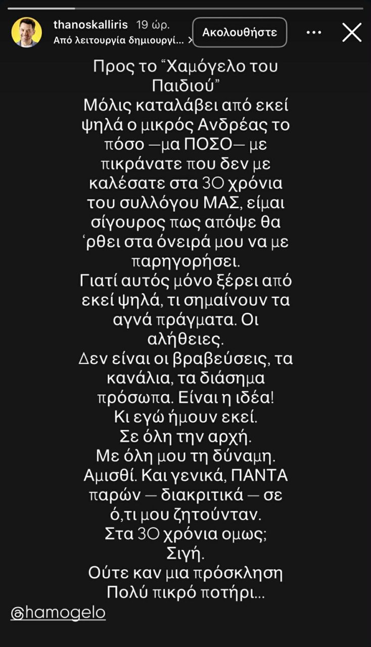 «Μόλις καταλάβει από εκεί ψηλά ο μικρός Ανδρέας το πόσο -μα ΠΟΣΟ- με πικράνατε που δεν με καλέσατε στα 30 χρόνια του συλλόγου ΜΑΣ, είμαι σίγουρος πως απόψε θα ‘ρθει στα όνειρά μου να με παρηγορήσει. Γιατί αυτός μόνο ξέρει από εκεί ψηλά τι σημαίνουν τα αγνά πράγματα. Οι αλήθειες», γράφει χαρακτηριστικά ο Θάνος Καλλίρης στην ανάρτησή του.