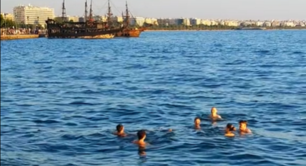 Το απόγευμα της Κυριακής, μια ομάδα νέων αποφάσισε να αψηφήσει τα παραξενεμένα βλέμματα των περαστικών και να βουτήξει στα νερά του Θερμαϊκού, σε απόσταση αναπνοής από τον Λευκό Πύργο της Θεσσαλονίκης.