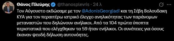 «Τον Αύγουστο εκδώσαμε με τον Άδωνι Γεωργιάδη και τη Σέβη Βολουδάκη ΚΥΑ για τον περαιτέρω ιατρικό έλεγχο ανηλικότητας των παράνομων μεταναστών που δηλώνουν ανήλικοι. Από τα 104 πρώτα ύποπτα περιστατικά που ελέγχθηκαν τα 59 ήταν ενήλικοι. Οι συνέπειες για όσους έκαναν ψευδή δήλωση αυτονόητες».