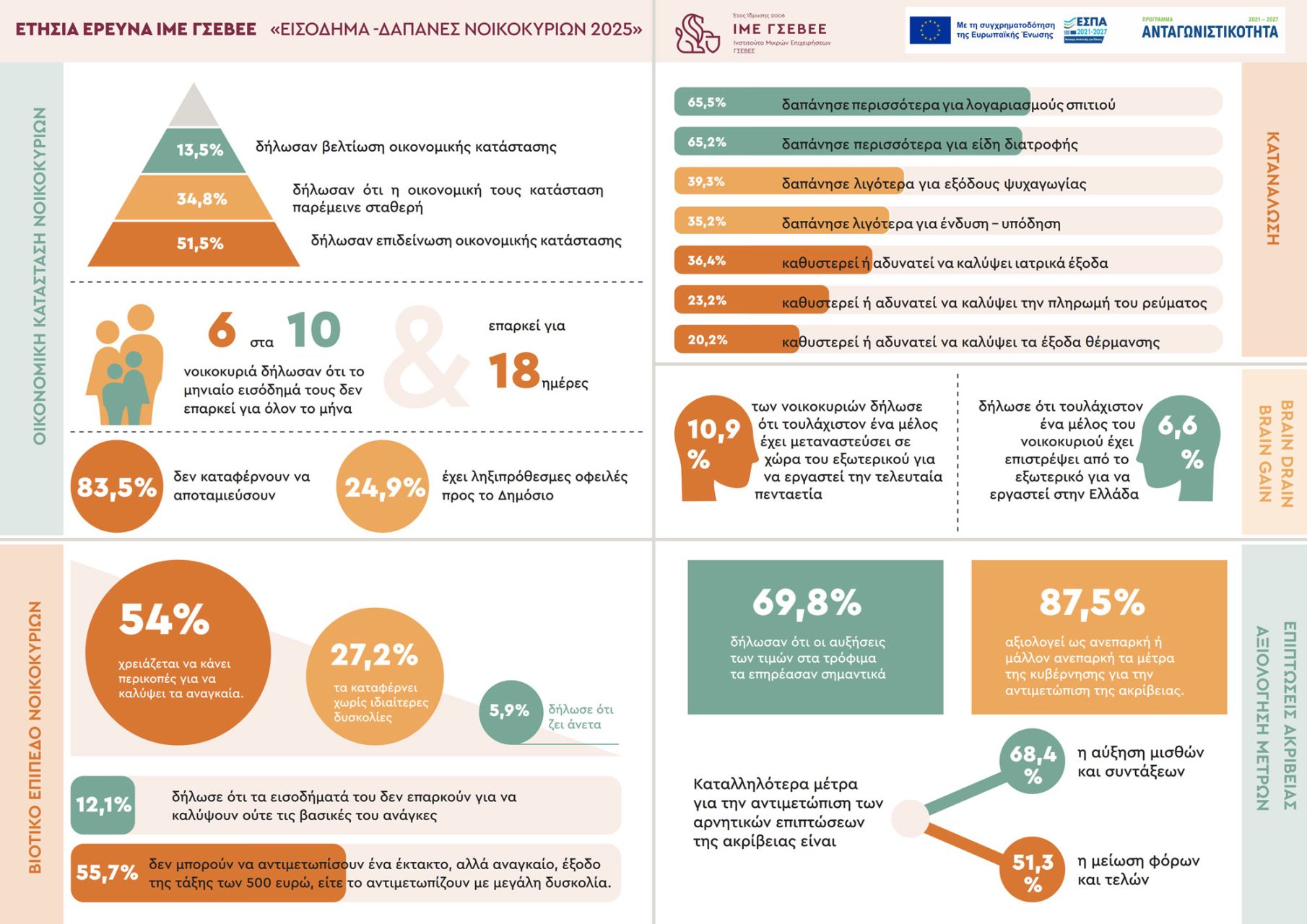 Την ετήσια έρευνά του έδωσε στη δημοσιότητα το Ινστιτούτο Μικρών Επιχειρήσεων (ΙΜΕ) της ΓΣΕΒΕΕ, που αναφέρεται στο εισόδημα και τις δαπάνες διαβίωσης των νοικοκυριών 2025 (14η κατά σειρά) και αποτυπώνει «τη συνεχιζόμενη και εντεινόμενη πίεση που δέχονται τα ελληνικά νοικοκυριά.