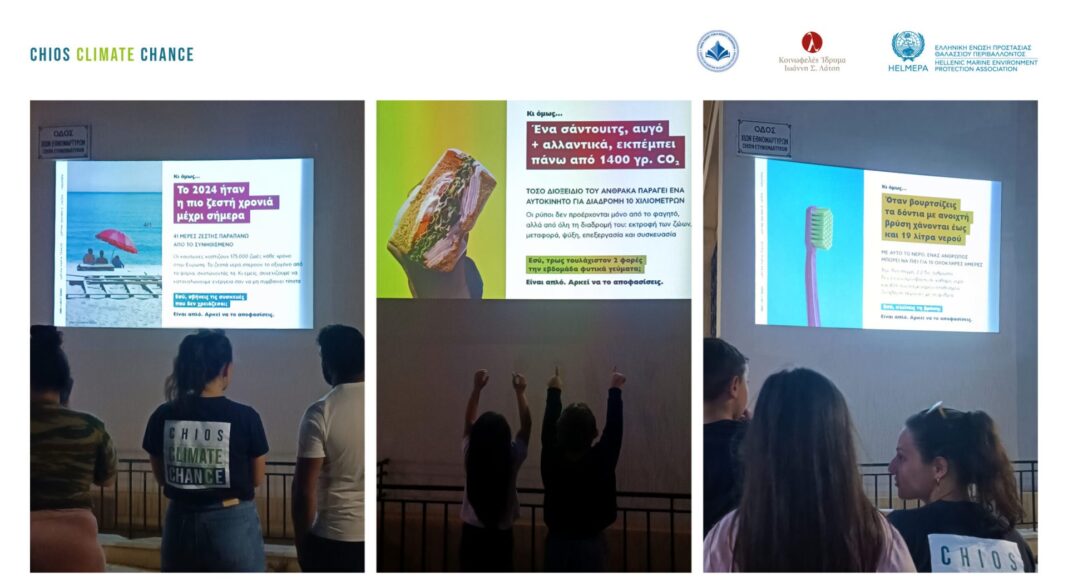 Οικολογική παρέμβαση στη Χίο πραγματοποίησε η Ελληνική Ένωση Προστασίας Θαλασσίου Περιβάλλοντος – HELMEPA, προβάλλοντας στις 8 Μαΐου 2025 στους τοίχους του Δημαρχείου Χίου μηνύματα για την κλιματική αλλαγή, μέσα από τη δράση του προγράμματος Chios Climate Chance (CCC).