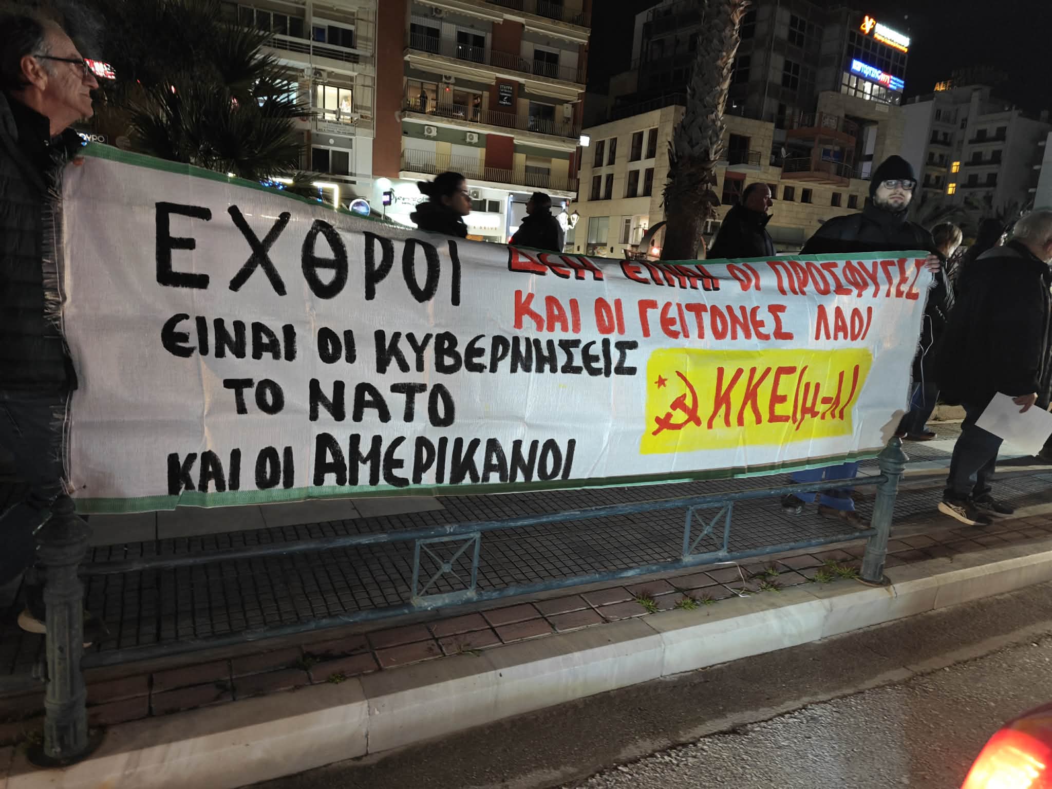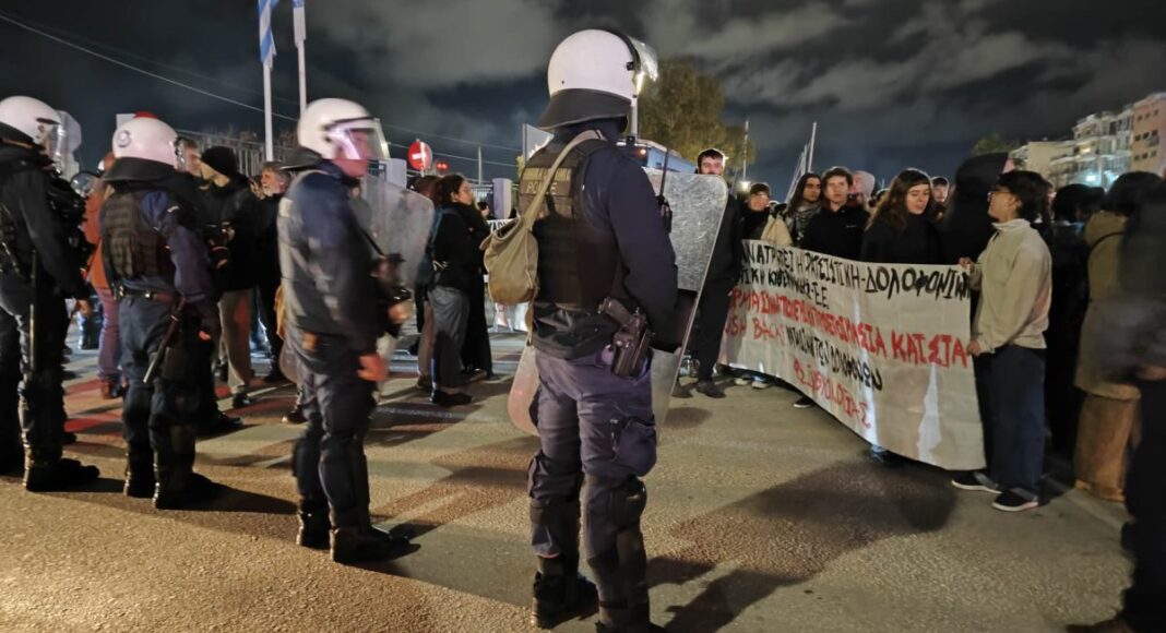 Στο λιμάνι, τους διαδηλωτές τους περίμεναν δύο διμοιρίες των ΜΑΤ αποκλείοντας την είσοδο και έξοδο του λιμανιού. Οι διαδηλωτές άνοιξαν πανό και φώναξαν συνθήματα.