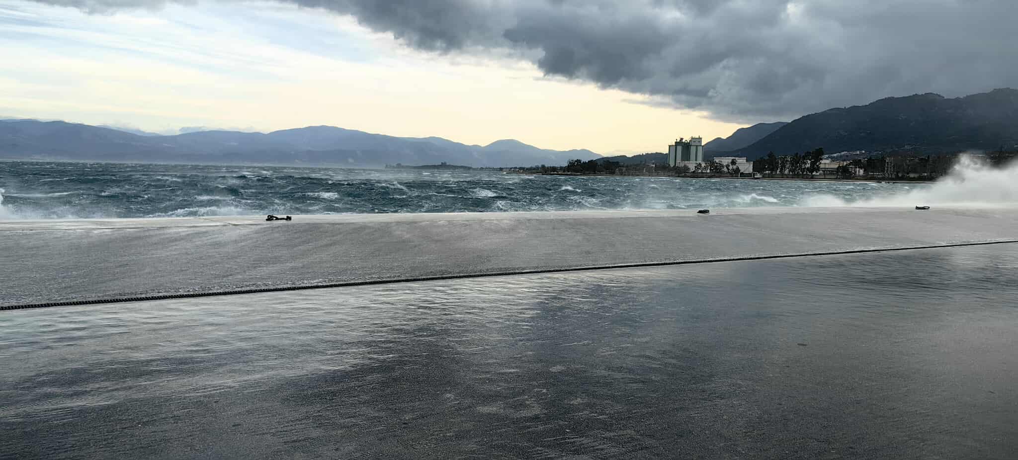 Τα κύματα σκεπάζουν την προβλήτα δημιουργώντας μία κατάσταση θύελλας. Προβλήματα όμως υπάρχουν και στην κυκλοφορία των οχημάτων στη γέφυρα Ρίου-Αντιρίου εξαιτίας των ισχυρότατων ανέμων.