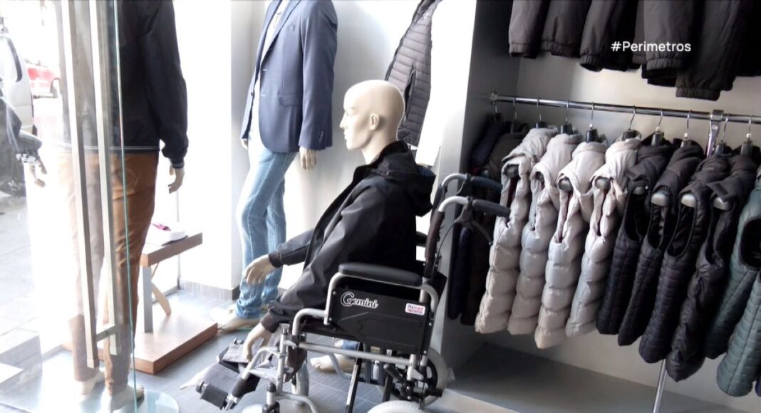 Εκεί που πέφτουν τα φώτα της προβολής μιας βιτρίνας δίπλα σε σε ρούχα, παπούτσια και είδη της καθημερινότητας, οι περαστικοί βλέπουν και αναπηρικά αμαξίδια. Μια κούκλα υπενθυμίζει ότι τα άτομα που βρίσκονται στα αμαξίδια έχουν το δικαίωμα να πηγαίνουν στην αγορά και να μπορούν να εισέλθουν στα καταστήματα.