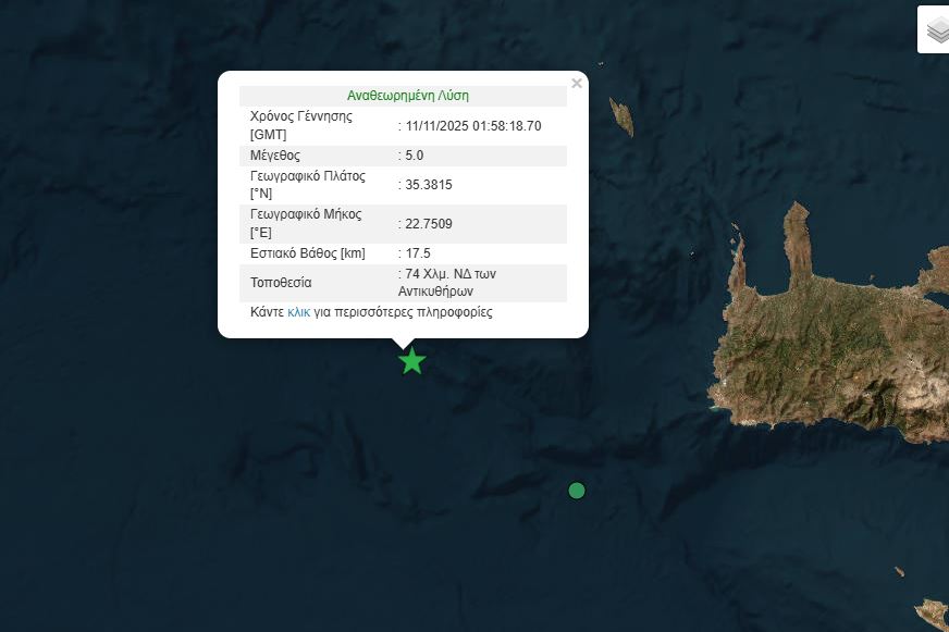 Σημειώνεται ότι σύμφωνα με την Αναθεωρημένη Λύση του Γεωδυναμικού Ινστιτούτου, το επίκεντρο εντοπίστηκε 74 χιλιόμετρα νοτιοδυτικά του νησιού, ανάμεσα στα Κύθηρα και την Κρήτη, με εστιακό βάθος τα 17,5 χλμ.