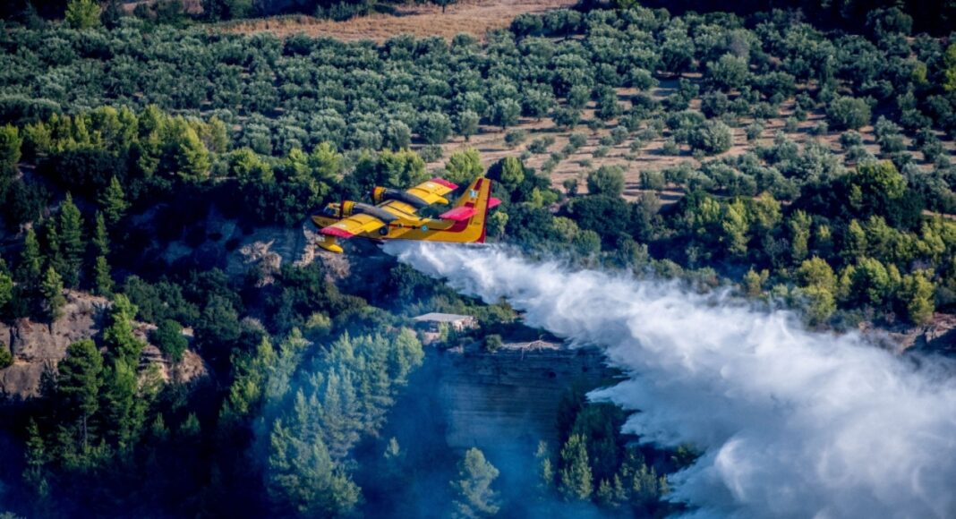 Στο δύσκολο έργο της κατάσβεσης συνδράμουν επίσης 6 αεροσκάφη και 2 ελικόπτερα, πραγματοποιώντας συνεχείς ρίψεις νερού.