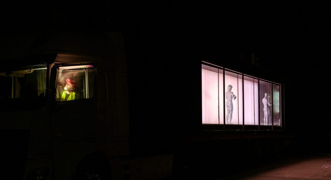 Η παράσταση πραγματοποιείται σε ένα φορτηγό μήκους δεκαπέντε μέτρων, το οποίο μοιάζει να κουβαλάει ένα μυστηριώδες φορτίο. Όταν τα ρολά τού κοντέινερ σηκώνονται, αποκαλύπτεται η ιδιόμορφη σκηνή – ένα διάφανο παράθυρο από πολυανθρακικό πλαστικό που επιτρέπει στο κοινό να βλέπει όσα συμβαίνουν εντός του κοντέινερ.