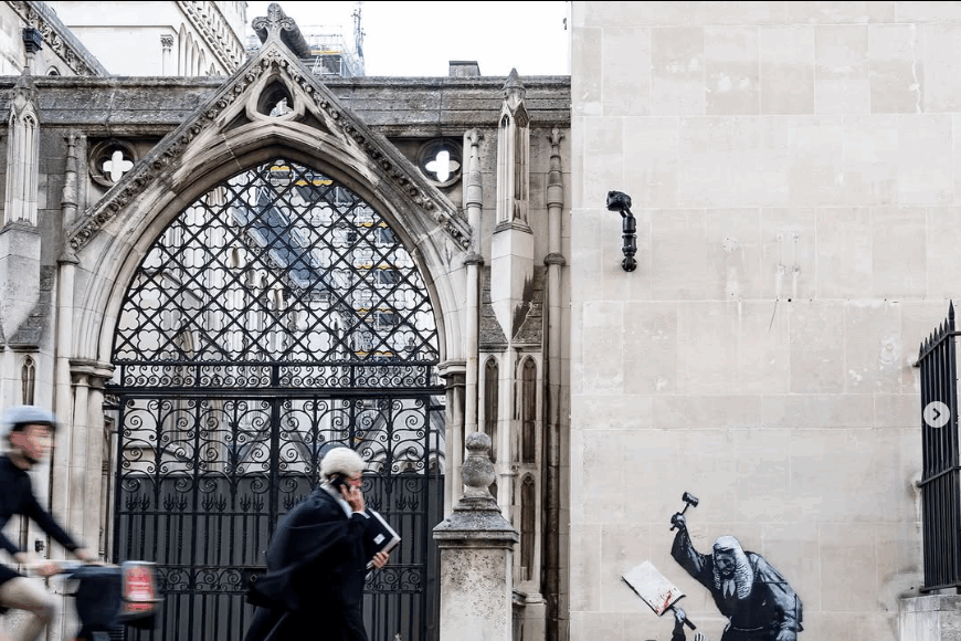 Ένα νέο έργο του Banksy, που απεικονίζει έναν δικαστή με τήβεννο να χτυπά με σφυρί έναν ανυπεράσπιστο διαδηλωτή που βρίσκεται στο έδαφος κρατώντας ένα ματωμένο πλακάτ, εμφανίστηκε στους τοίχους των Βασιλικών Δικαστηρίων στο κέντρο του Λονδίνου, πριν καλυφθεί γρήγορα από τους φρουρούς ασφαλείας.