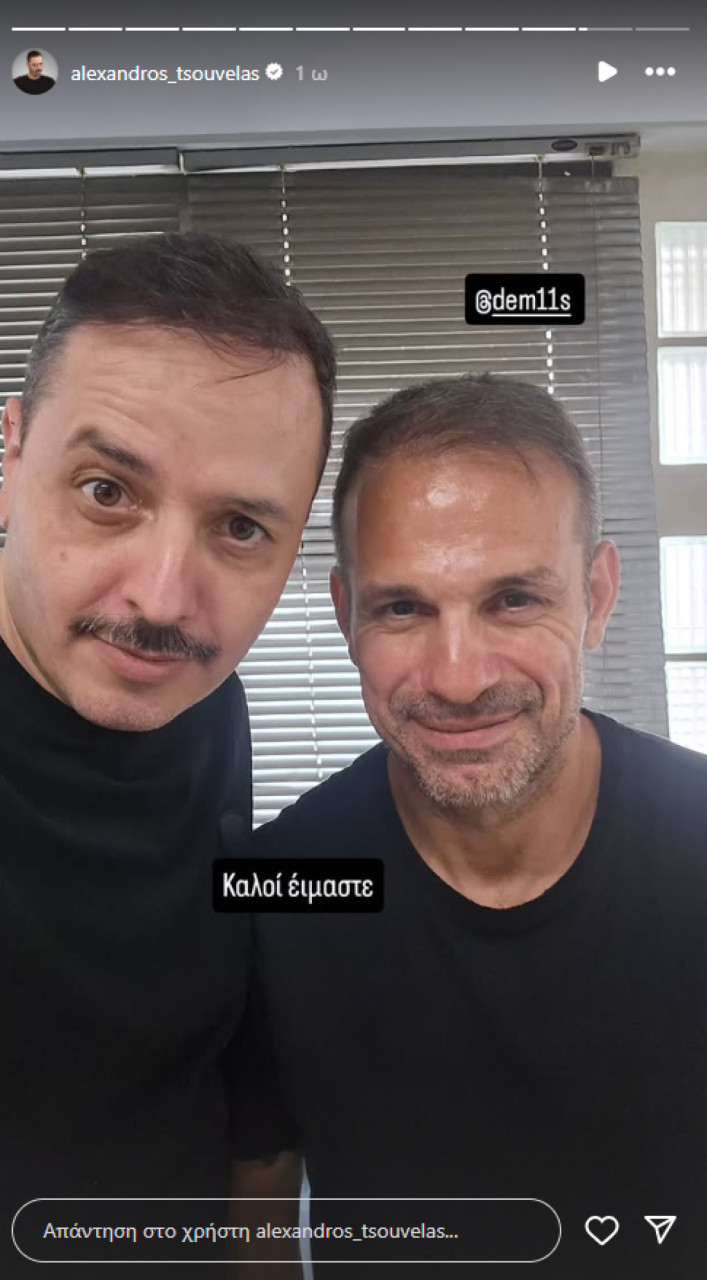 Ο Αλέξανδρος Τσουβέλας ανέβασε το στιγμιότυπο στα social media, γράφοντας: «Καλοί είμαστε». Εκεί ο Ντέμης Νικολαΐδης ποζάρει χαμογελαστός, προσπαθώντας να ξεπεράσει τον πόνο που είναι ακόμη νωπός από την τραγική απώλεια.
