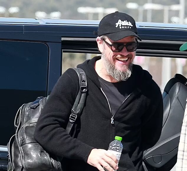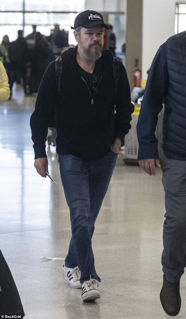 Ο 54χρονος Αμερικανός ηθοποιός έφτασε στο αεροδρόμιο με μακρύ γκρίζο μούσι. Προσπαθώντας να κρατήσει χαμηλό προφίλ, ο Ντέημον φορούσε γυαλιά ηλίου και μαύρο καπέλο του μπέιζμπολ. Ήταν casual με μαύρο πουλόβερ με φερμουάρ, μπλε τζιν και λευκά αθλητικά παπούτσια.