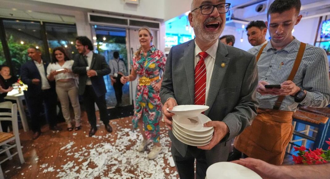 Μάλιστα, όπως αναφέρει το αμερικανικό πρακτορείο ειδήσεων AP και αποδεικνύουν φωτογραφικά στιγμιότυπα, ο εκλεκτός του Ντόναλντ Τραμπ, αφού συνεχάρη την Δημοκρατική αντιπαλό του για τη νίκη της, συμμετείχε στο ελληνικό γλέντι με το παραδοσιακό «σπάσιμο πιάτων».