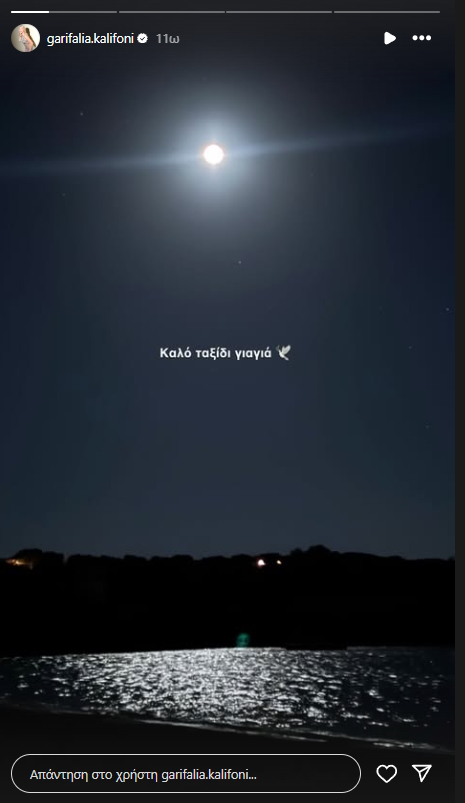 Συγκεκριμένα, η Γαρυφαλλιά Καληφώνη δημοσίευσε ένα νυχτερινό στιγμιότυπο με θέα το φεγγάρι και τη θάλασσα γράφοντας «Καλό ταξίδι γιαγιά».