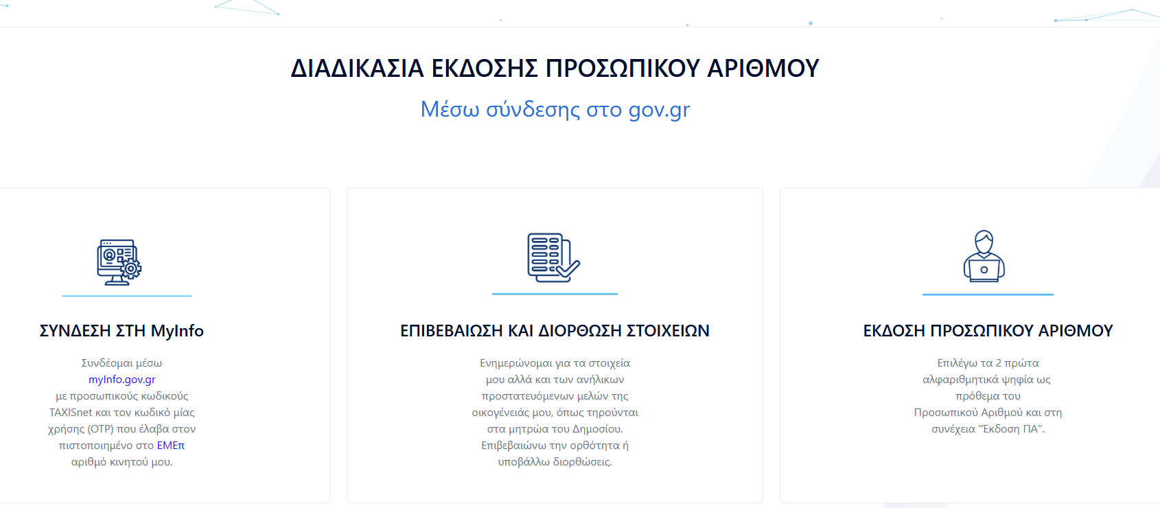 Μετά την είσοδο στην εφαρμογή μέσω των κωδικών Taxisnet, οι πολίτες θα δοκιμάζουν διπλή ταυτοποίηση μέσω OTP, επιτρέποντάς τους να δουν και να επιβεβαιώσουν τα στοιχεία τους στα κρατικά μητρώα. Αν διαπιστώσουν ανακρίβειες, μπορούν να υποβάλουν αίτημα διόρθωσης, είτε απευθείας μέσω της πλατφόρμας myInfo είτε στα αρμόδια ΚΕΠ ή άλλες υπηρεσίες. Στη συνέχεια, γίνεται αυτόματος συγχρονισμός των μητρώων και εκδίδεται ο Προσωπικός Αριθμός, ο οποίος, όπως αναφέρθηκε, παραμένει σταθερός καθ’ όλη τη διάρκεια ζωής του πολίτη.