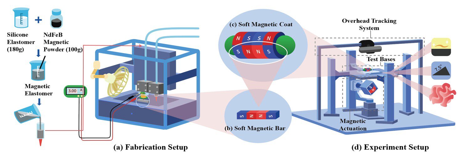 Ο κύριος στόχος της πρόσφατης μελέτης ήταν να αξιολογηθούν οι διαφορετικές μέθοδοι ενεργοποίησης του ρομπότ ώστε να μπορεί να ολοκληρώνει διαφορετικές εργασίες μέσα στο ανθρώπινο σώμα. Αντί να τοποθετήσουν έναν ογκώδη μόνιμο μαγνήτη στο εσωτερικό της κάψουλας, οι ερευνητές επένδυσαν το εξωτερικό της κέλυφος με ένα μαλακό μαγνητικό σύνθετο υλικό από σωματίδια NdFeB ενσωματωμένα σε σιλικόνη. Κατά τη διάρκεια της 3D εκτύπωσης, έλεγξαν την κατεύθυνση μαγνήτισης ώστε να δημιουργήσουν ένα ανισοτροπικό μαγνητικό κέλυφος με συγκεκριμένο μοτίβο.