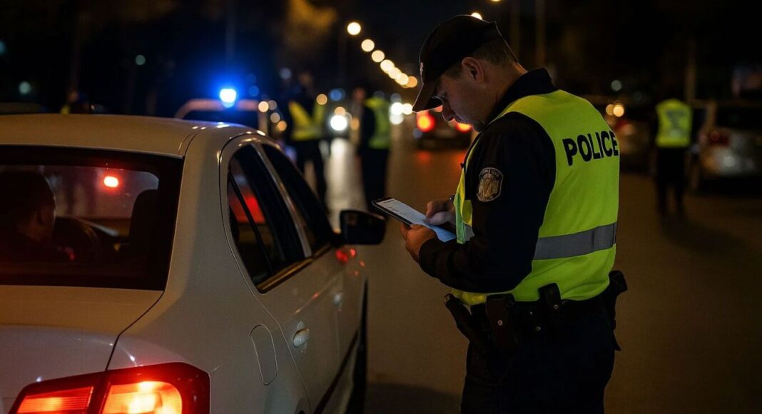 Με ηχητικές σημάνσεις από τις σφυρίχτρες, αναμμένους φακούς και κρατώντας στα χέρια τους μετρητές αλκοόλ, αστυνομικοί της τροχαίας σταματούν και ελέγχουν διερχόμενους οδηγούς.