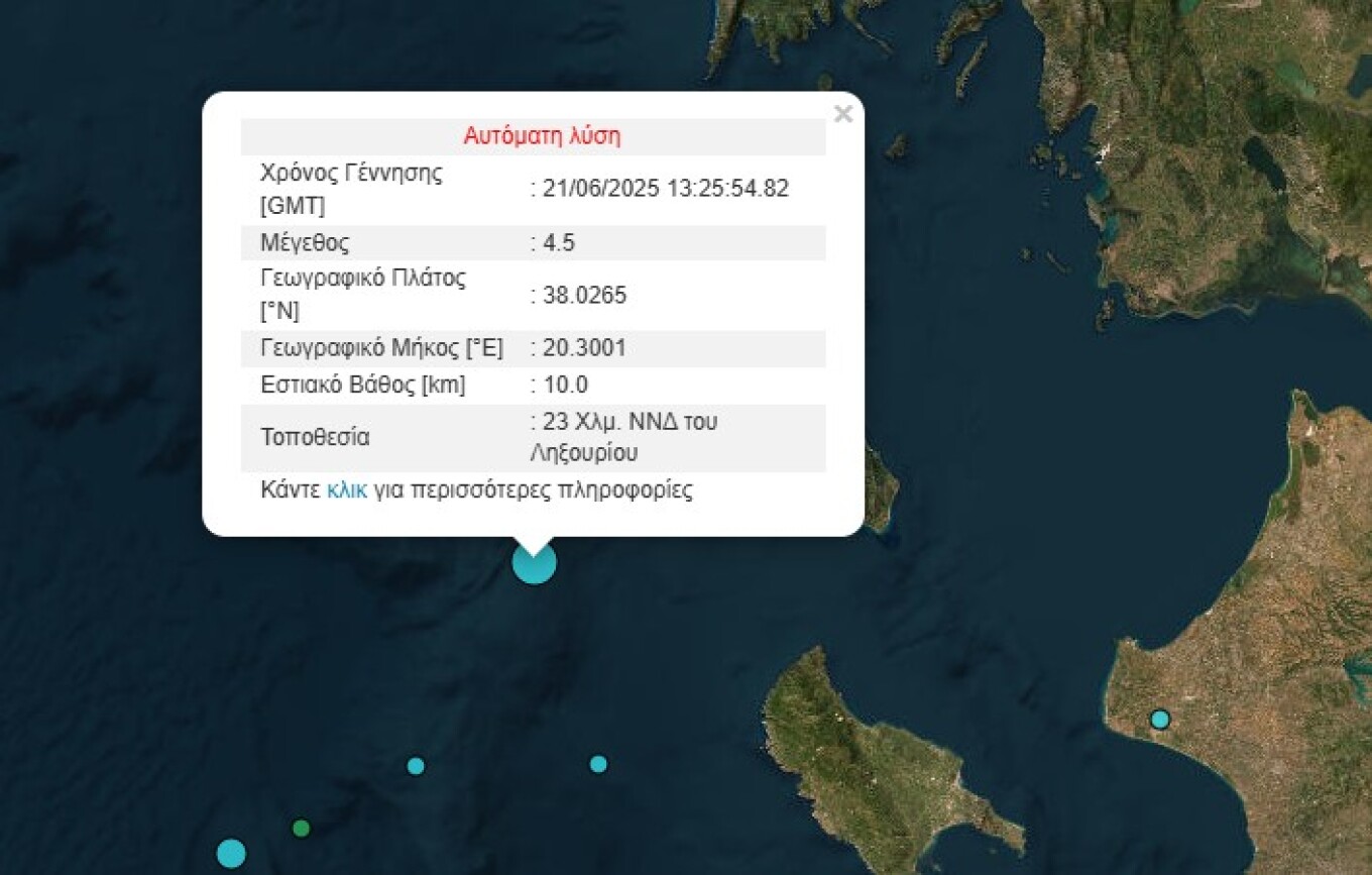 Σεισμός 4,5 Ρίχτερ σημειώθηκε στις 16.26 το Σάββατο ανοιχτά της Κεφαλονιάς.