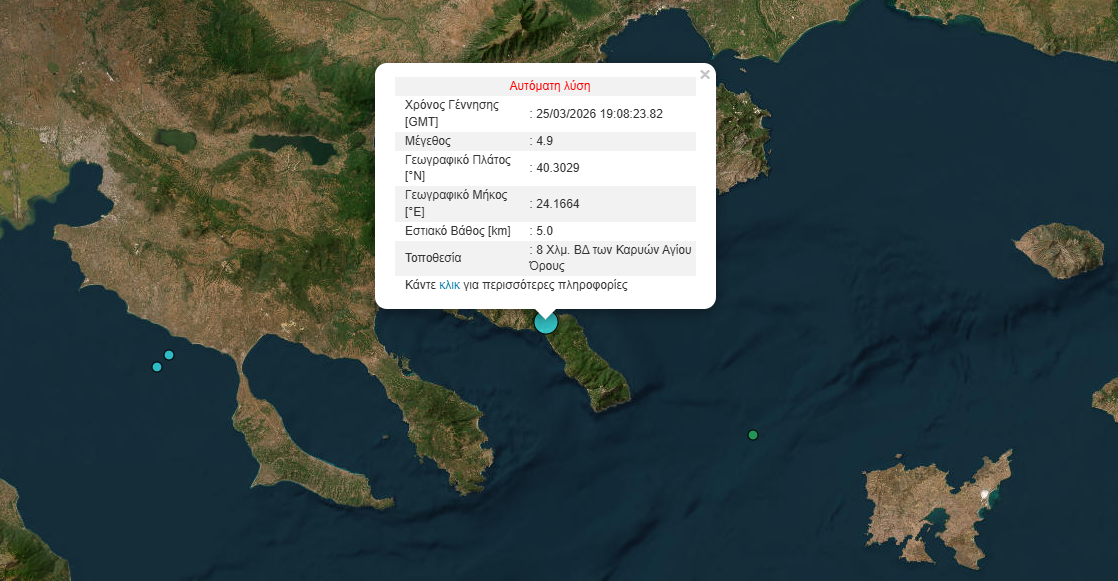 ΚΑΙΡΟΣ Καιρός: Νεφώσεις και τοπικές καταιγίδες – Βαθμιαία βελτίωση από το μεσημέρι της 25ης Μαρτίου Σεισμός 4,9 Ρίχτερ στο Άγιο Όρος News Ισχυρή σεισμική δόνηση 4,9 βαθμών της κλίμακας Ρίχτερ σημειώθηκε το βράδυ της Τετάρτης 25 Μαρτίου, 8 χιλιόμετρα ΒΔ των Καρυών Αγίου Όρους. Σύμφωνα με το Γεωδυναμικό Ινστιτούτο Αθηνών, το εστιακό βάθος υπολογίζεται στα 5 χιλιόμετρα. Διάβασε ακόμα News Μονή Αγίας Λαύρας: Η αναπαράσταση της ορκωμοσίας των αγωνιστών του 1821 News Η ΑΑΔΕ αποκάλυψε διεθνές δίκτυο λαθρεμπορίου τσιγάρων με τους ελεγκτές του ΔΕΟΣ – Προχώρησε σε συλλήψεις σε Ελλάδα και άλλες χώρες News Σεισμός 4,9 Ρίχτερ στο Άγιο Όρος, αισθητός στη Θεσσαλονίκη και τις Σποράδες News Τραγωδία στα Λιμανάκια Βουλιαγμένης: Εντοπίστηκε στο Πηγάδι του Διαβόλου η σορός του 34χρονου δύτη Ad Άλλες Ειδήσεις Μοιράσου το Μοιράσου το FacebookTwitterLinkedinCopy URL Προηγούμενο άρθροΔέος και συγκίνηση στην αναπαράσταση της Επανάστασης στην ιστορική Ιερά Μονή Αγίας ΛαύραςΕπόμενο άρθροΗ Ουγγαρία σταματά τις παραδόσεις φυσικού αερίου στην Ουκρανία μέσω του αγωγού Ντρούζμπα
