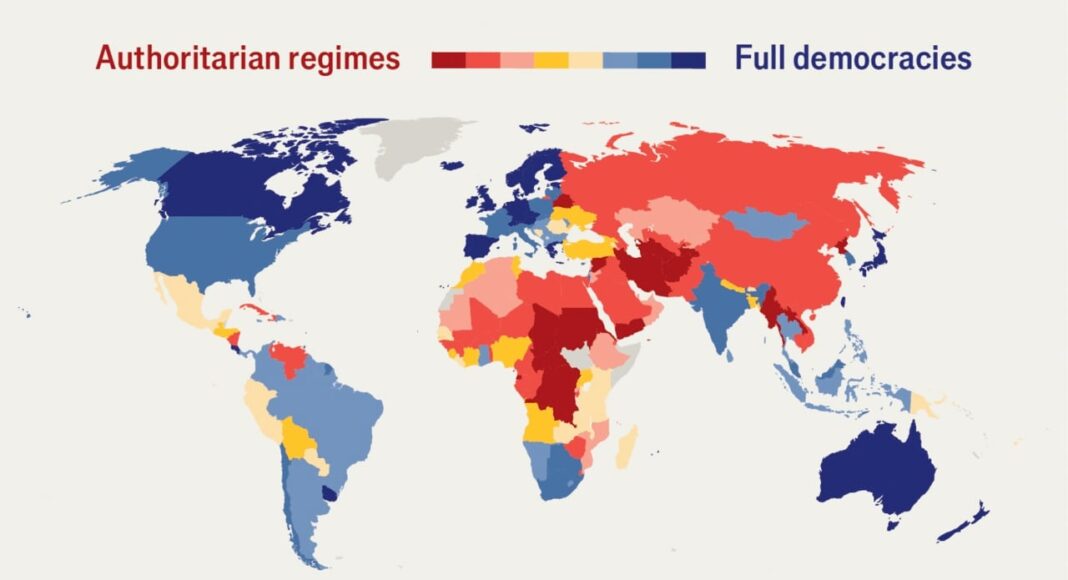 Περισσότερο από το ένα τρίτο του παγκόσμιου πληθυσμού ζει υπό αυταρχική διακυβέρνηση. Η συνολική βαθμολογία του δείκτη παγκόσμιας δημοκρατίας μειώθηκε από 5,52 το 2006 σε 5,23 το 2023 και σε ιστορικό χαμηλό 5,17 το 2024.